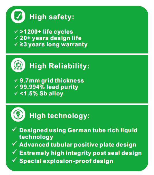 แผ่น: แผ่นกริดที่หนาที่สุดในอุตสาหกรรม (9.7 มม.); โลหะผสมแคลเซียมตะกั่วดีบุกสูง ออกแบบให้มีปริมาณแอนติโมนีต่ำ Sb<1.5%; ตะกั่วหลัก 1 ความบริสุทธิ์ของตะกั่วมากกว่า 99.994%;