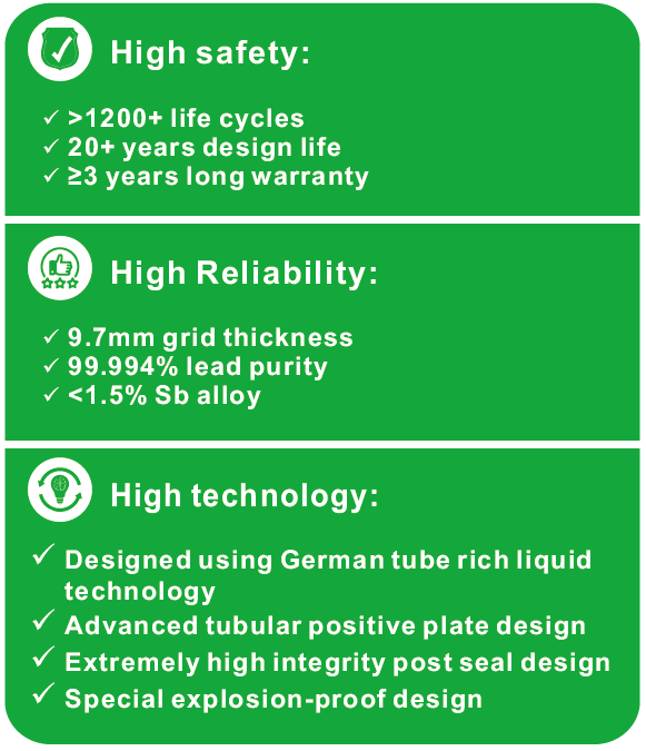 | เทคโนโลยี | แบตเตอรี่ตะกั่วกรดแบบท่อ + อินเวอร์เตอร์ + โมดูล PV |
