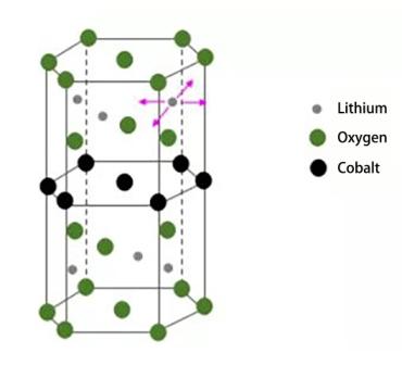 นี่คือจุดเริ่มต้นของการเคลื่อนที่ของลิเธียมไอออนในกระบวนการชาร์จ และเป็นขั้นตอนที่ง่ายที่สุดและมีความต้านทานน้อยที่สุดในบรรดาสี่ขั้นตอน ความต้านทานของลิเธียมไอออนแบบแคโทดอินเตอร์คาเลชันส่วนใหญ่ขึ้นอยู่กับโครงสร้างของวัสดุแคโทด ลิเธียมโคบอลเตตมีโครงสร้างแบบชั้น และสามารถฝังลิเธียมไอออนได้อย่างอิสระจากด้านหน้า ด้านหลัง ด้านซ้าย และด้านขวา ดังนั้นจึงมีประสิทธิภาพที่ดีแม้ในอุณหภูมิต่ำ โครงสร้างโมเลกุลของลิเธียมโคบอลเตตแสดงไว้ดังนี้