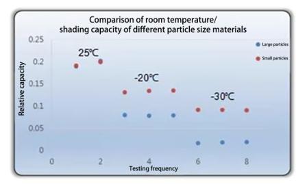 นอกจากนี้ สำหรับอนุภาคของวัสดุแอคทีฟ ยิ่งอนุภาคมีขนาดเล็ก เส้นทางการเคลื่อนที่ของลิเธียมไอออนก็จะสั้นลง ที่อุณหภูมิห้อง เนื่องจากการแพร่กระจายอย่างรวดเร็วของลิเธียมไอออน อิทธิพลของอนุภาคขนาดใหญ่และขนาดเล็กที่มีต่อความจุจึงยังไม่ชัดเจน แต่ที่อุณหภูมิต่ำ ข้อดีของวัสดุอนุภาคขนาดเล็กจะเริ่มปรากฏให้เห็น ผลการเปรียบเทียบความจุของอนุภาคของวัสดุชนิดเดียวกันที่อุณหภูมิต่างกันมีดังนี้