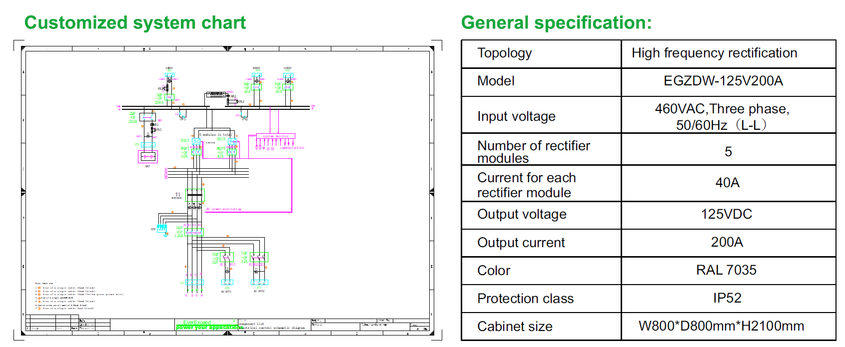 EverExceed ได้ปรับแต่งเครื่องชาร์จ DC แบบโมดูลาร์ 125VDC200A แบบเรียงกระแสความถี่สูงตามความต้องการของลูกค้า ระบบปฏิบัติการส่วนใหญ่ใช้โมดูลเรียงกระแสความถี่สูง 5 โมดูล และติดตั้งโมดูลตรวจสอบและระบบป้องกันไฟกระชากฟ้าผ่า โหลดเอาต์พุตใช้โซ่ซิลิคอนบัคที่ปรับแต่งได้ (บัคสูงสุด 35V, 50A) นอกจากนี้ ตู้ LP52 ยังมีฟังก์ชันต่างๆ เช่น การชดเชยอุณหภูมิ การทดสอบการคายประจุแบตเตอรี่ และไฟรั่วลงดิน เครื่องชาร์จ DC แบบปรับแต่งนี้มีฟังก์ชันการตรวจสอบและป้องกันที่ดีกว่า ไม่เพียงแต่ตอบสนองความต้องการด้านพลังงานของอุปกรณ์พิเศษในสถานีไฟฟ้าเท่านั้น แต่ยังตรวจสอบสถานะการทำงาน แจ้งเตือนเจ้าหน้าที่ผู้ปฏิบัติหน้าที่ทันทีเมื่อเกิดข้อผิดพลาด และช่วยให้มั่นใจได้ว่าอุปกรณ์ในสถานีไฟฟ้าทำงานได้ตามปกติ